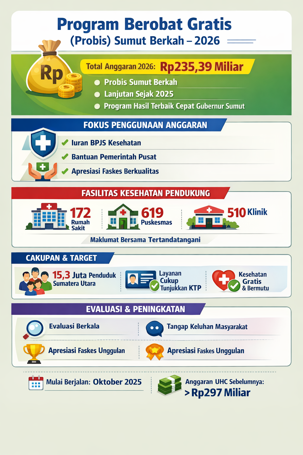 MEDAN — Pemerintah Provinsi Sumatera Utara kembali mengalokasikan anggaran besar untuk melanjutkan Program Berobat Gratis (Probis) Sumut Berkah pada tahun anggaran 2026. Total dana yang disiapkan mencapai Rp235,39 miliar, sebagai bagian dari komitmen pemerintah daerah dalam memperkuat akses layanan kesehatan masyarakat.