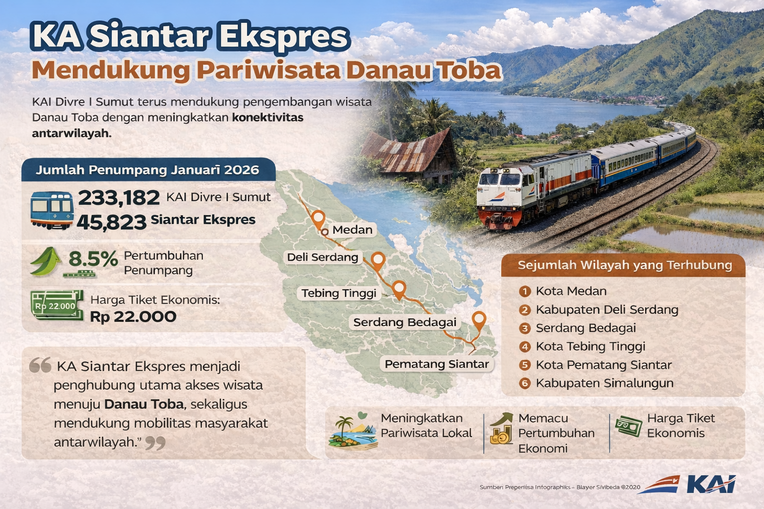 “KA Siantar Ekspres menjadi penghubung utama akses wisata menuju Danau Toba, sekaligus mendukung mobilitas masyarakat antarwilayah,” ujarnya, Rabu (4/2/2026).